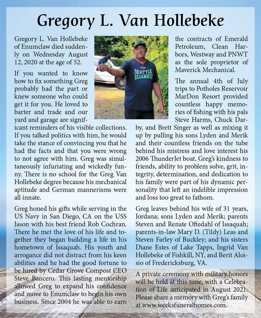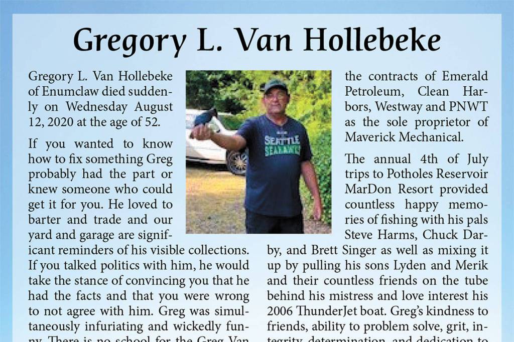 Gregory L. Van Hollebeck died Aug. 12, 2020, at the age of 52.