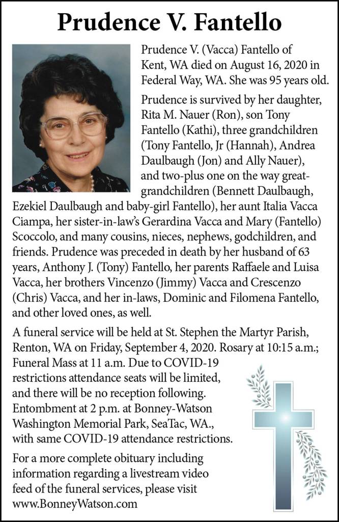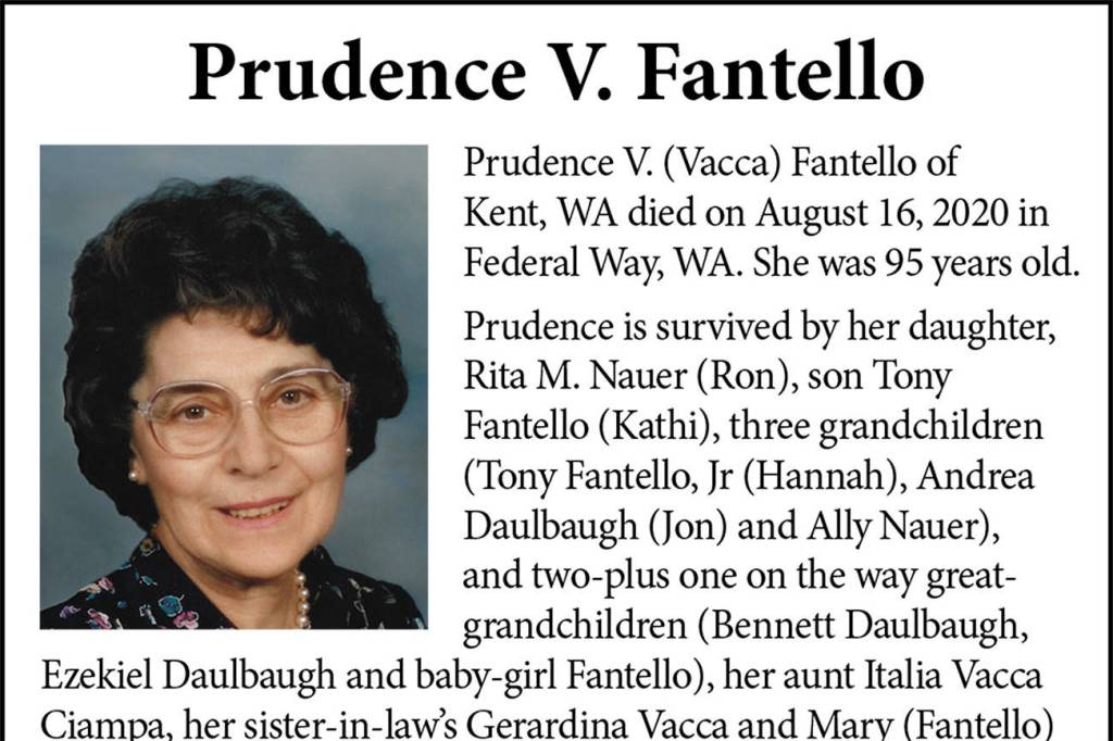 Prudence Vacca Fantello died Aug. 16, 2020, at the age of 95.