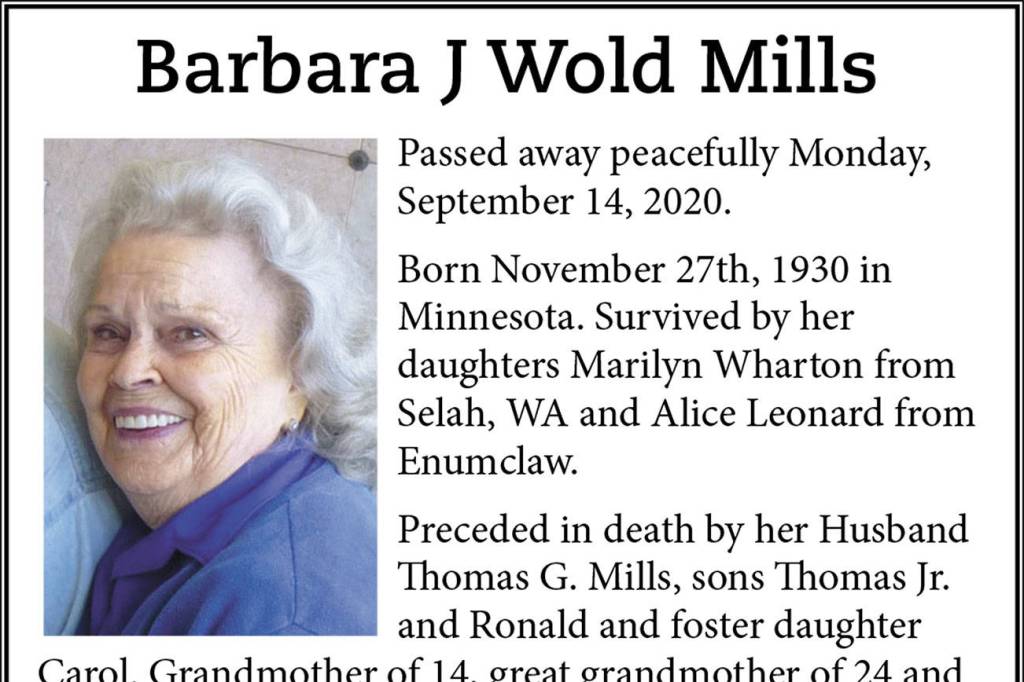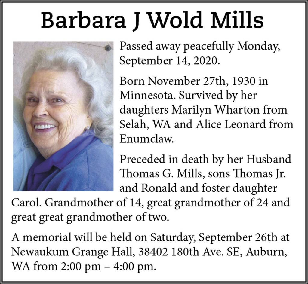 Barbara J. Wold Mills died Sept. 14, 2020, at the age of 89.