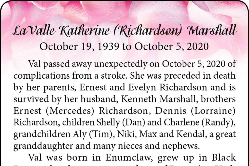 LaValle Katherine (Richardson) Marshall died Oct. 5, 2020, at the age of 80.