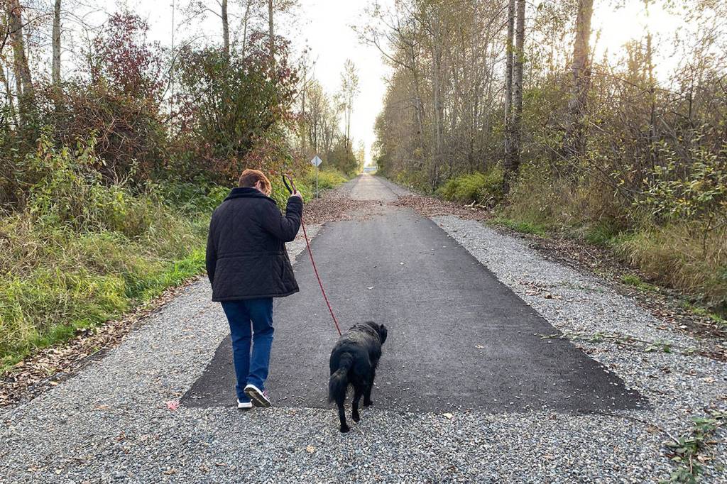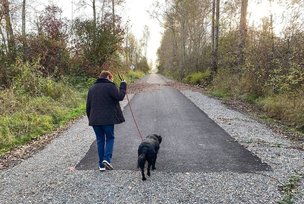 A new paved trail, provided by the city of Enumclaw, extends to a point just shy of the city limits. Here, a trail user and canine companion turn and head back toward Battersby Avenue. Photo by Kevin Hanson