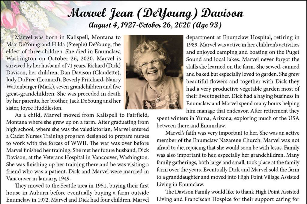 Marvel Jean (DeYoung) Davison died Oct. 26, 2020, at the age of 93.