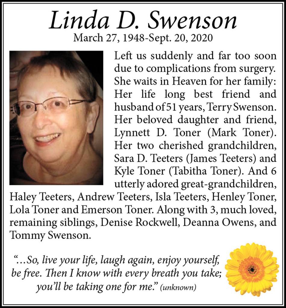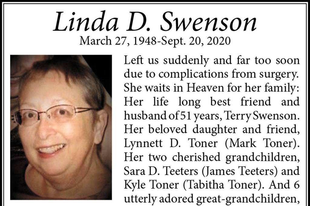 Linda D. Swenson died Sept. 20, 2020, at the age of 72.