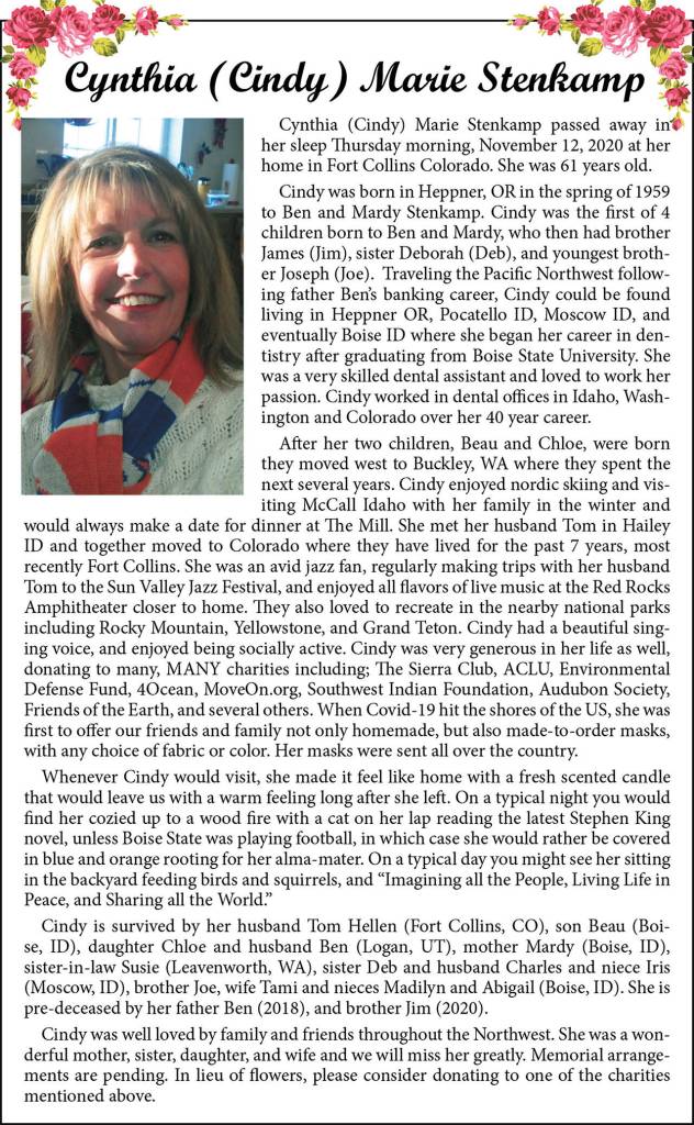 Cynthia Marie Stenkamp died Nov. 12, 2020, at the age of 61.