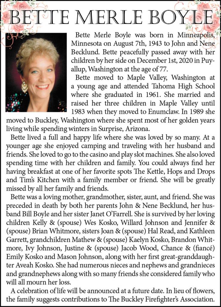Bette Merle Boyle died Dec. 1, 2020, at the age of 77.