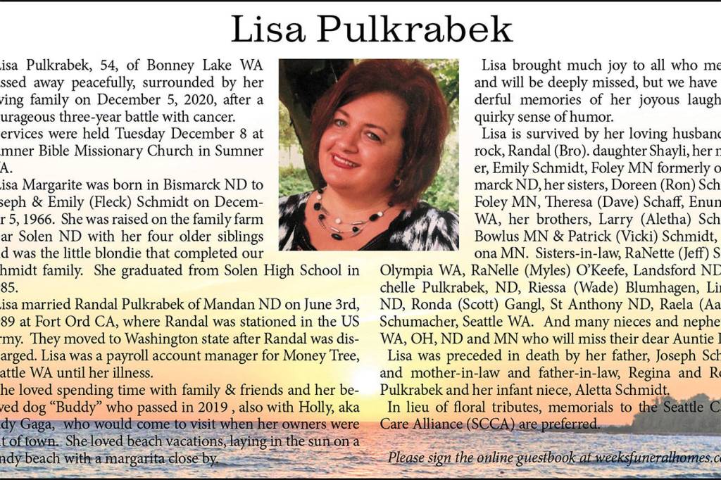 Lisa Pulkrabek died Dec. 5, 2020, at the age of 54.