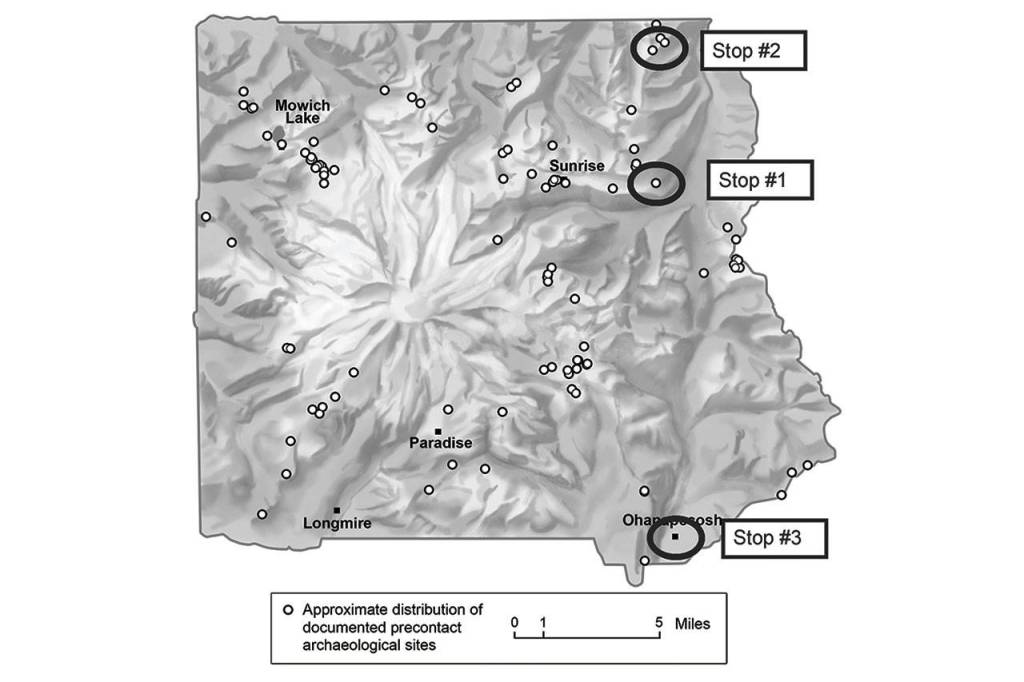 In November’s column, we saw that the excavation of a 1,000 year-old hunter’s camp along Fryingpan Creek on Mount Rainier’s northeast side provided proof that Native Americans had traveled to the mountain for generations. The find didn’t stamp out the mistaken idea that indigenous people avoided the high country, but the ensuing 30 years of diligent work by archaeologists and tribal experts would eventually reveal a robust portrait of peoples’ relationship with Tahoma (one of several Native names for the mountain). In today’s column, we’ll take a virtual field trip to visit some of Mount Rainier’s most important archaeological locations. So lace up your hiking boots, grab your daypacks, and let’s go!