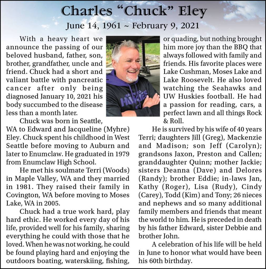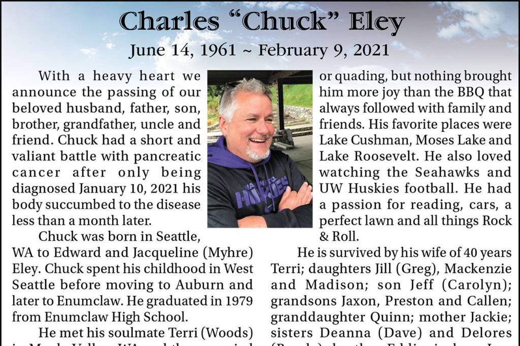 Charles “Chuck” Eley died Feb. 9, 2021, at the age of 59.