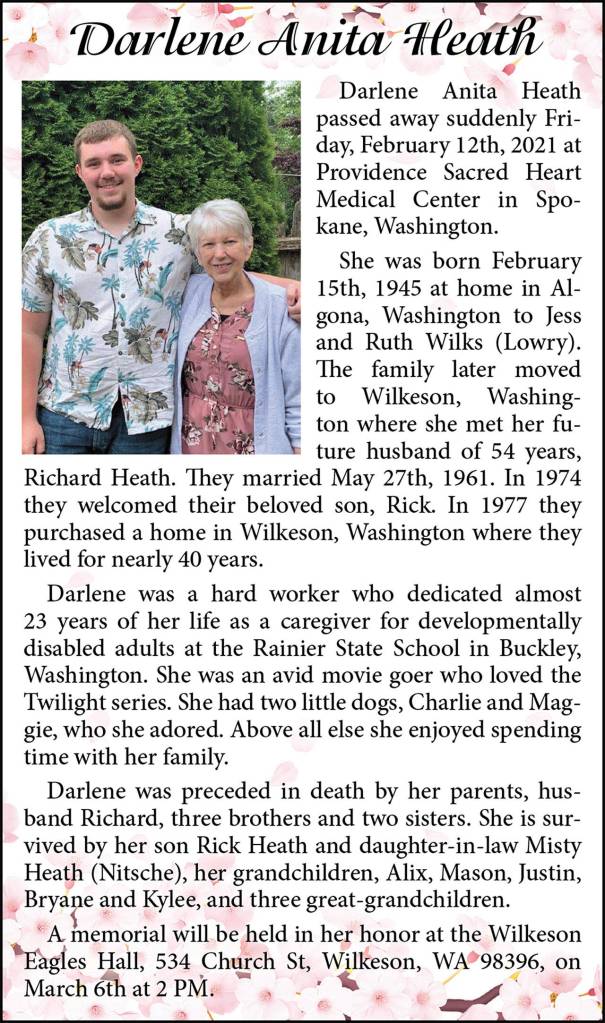 Darlene Anita Heath died Feb. 12, 2021 at the age of 75.