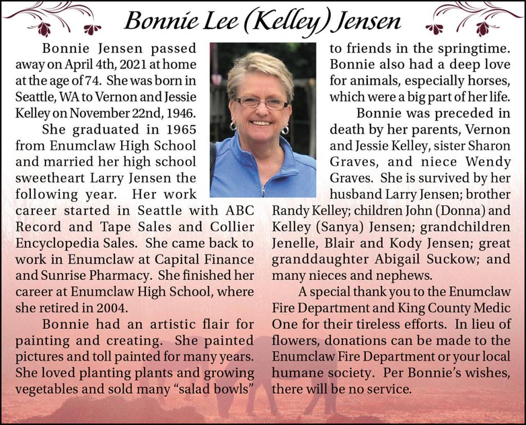 Bonnie Lee (Kelley) Jensen died April 4, 2021, at the age of 74.