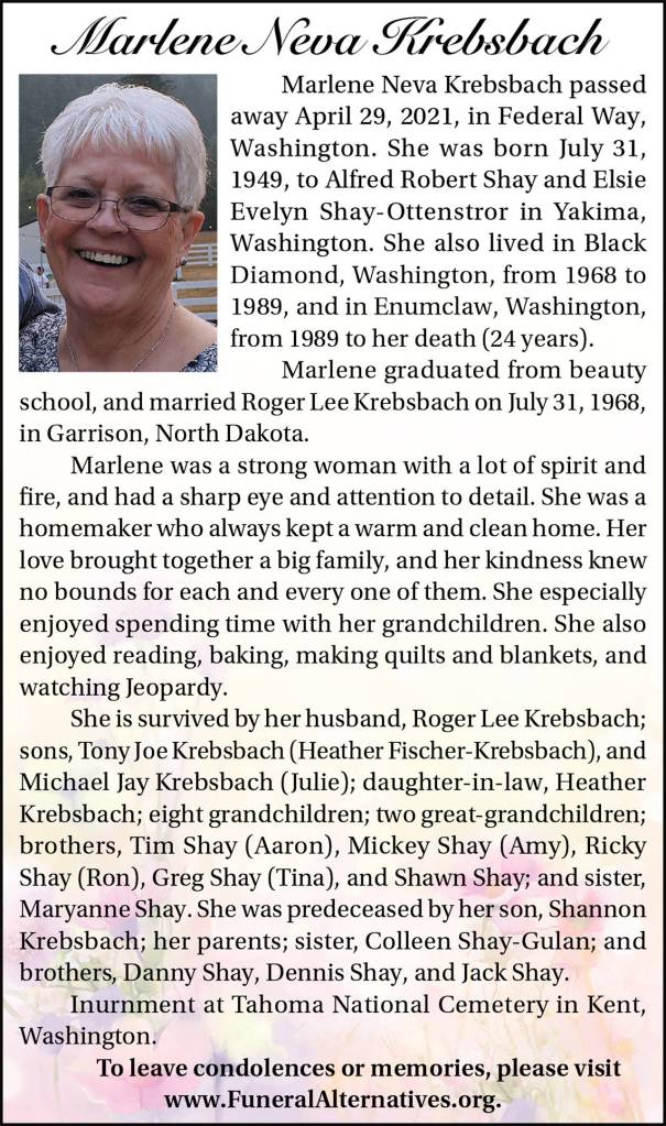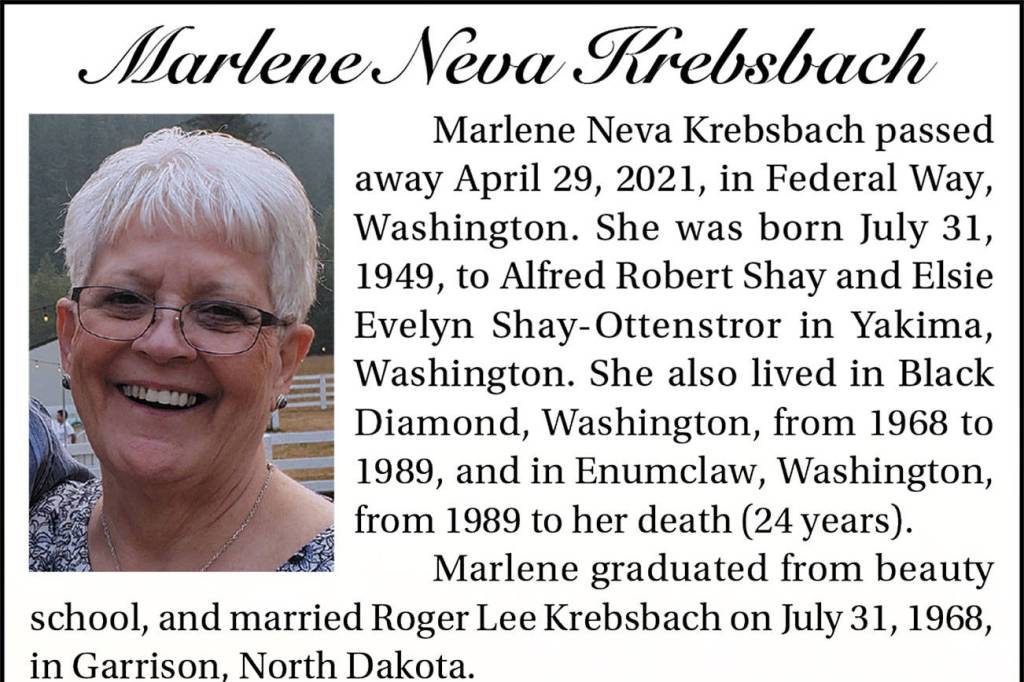 Marlene Neva Krebsbach died April 29, 2021, at the age of 71.