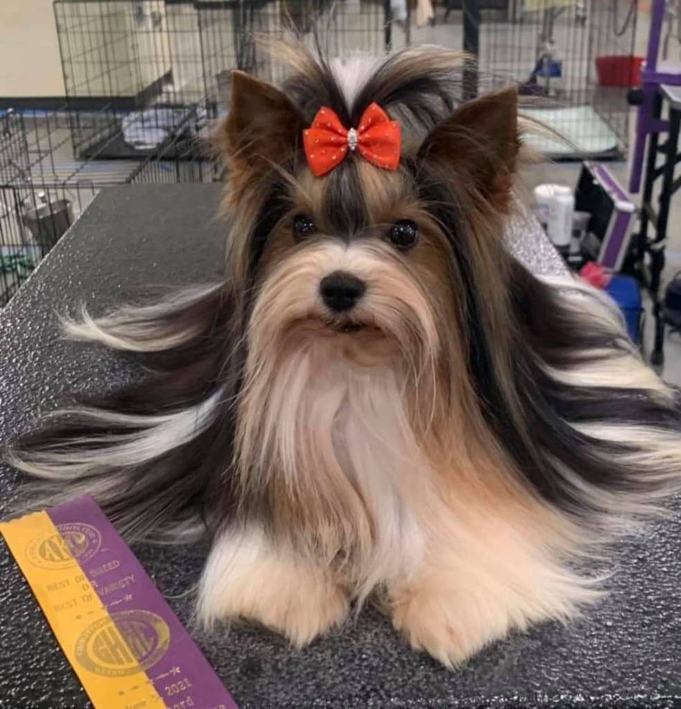 The Westminster website describes the breed, which was developed in Germany in the 1980s, this way: “This whimsical toy breed is light-hearted, intelligent, and amusing. The Biewer Terrier is an elegant, long-haired dog with a breed signature ponytail. Their fun-loving, childlike attitude makes them a devoted, loyal, and obedient companion, despite being mischievous at times.”