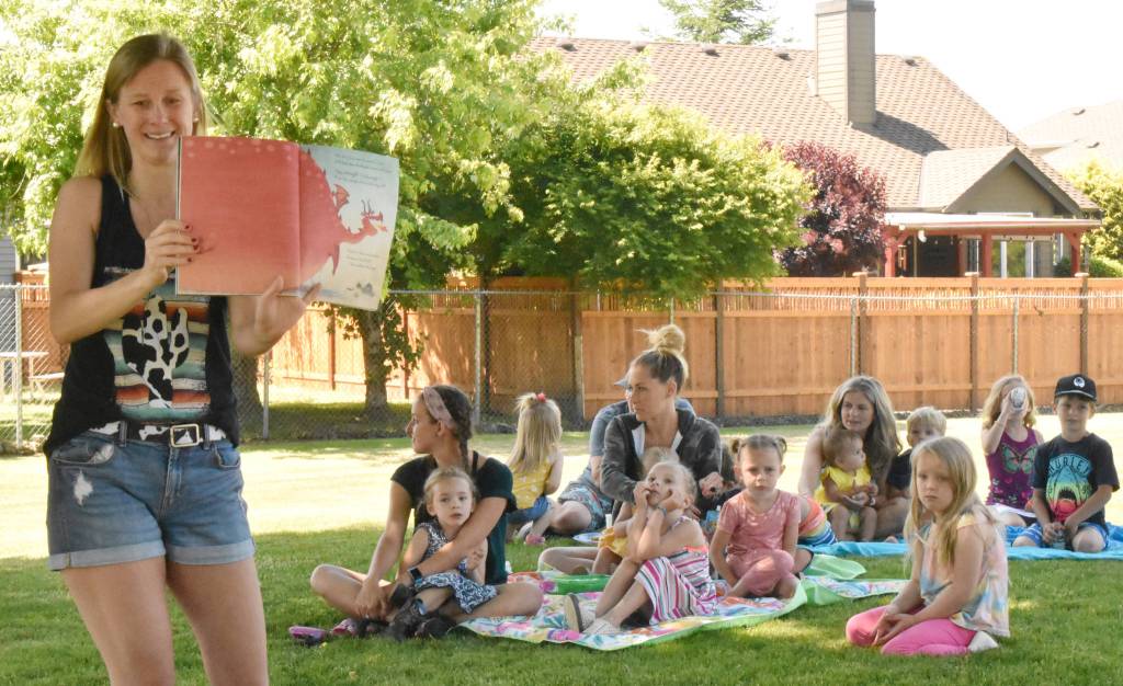 Every Tuesday at 11 a.m., Aubree Axelson reads stories for kids and parents at Flensted Park in Enumclaw. It’s strictly a drop-in session, no charge and no need to register, organized by the Elk Ridge Elementary kindergarten teacher.