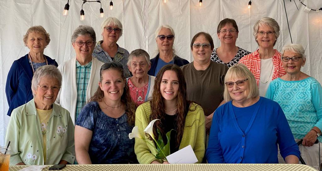 Local P.E.O. members pose for a picture with Isabella Hoyer, who recently won a scholarship from the women’s organization. Front row, from left to right: Nancy West, Dawn Hoyer (Isabella’s mother), Isabella, and Cherl Schneider. Middle row: Cherie Murchie, Sue Vannatter, Heidi Russell, and Kay Raeder. Back row: Sue Reiter, Linda Irrgang, Linda Fisher, Eva Dietz, and Martha Blodgett.