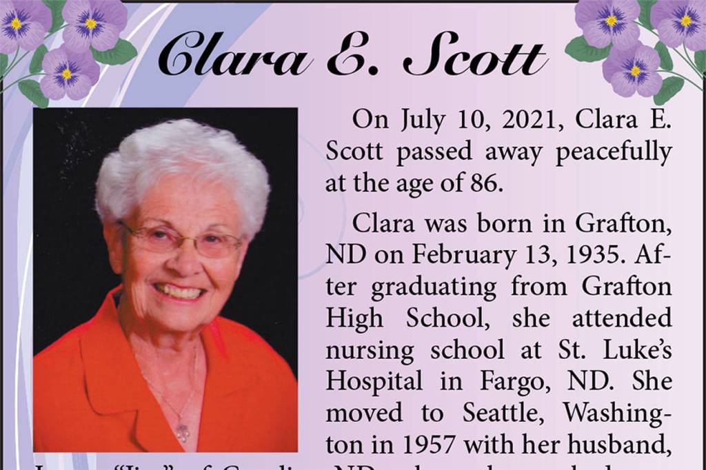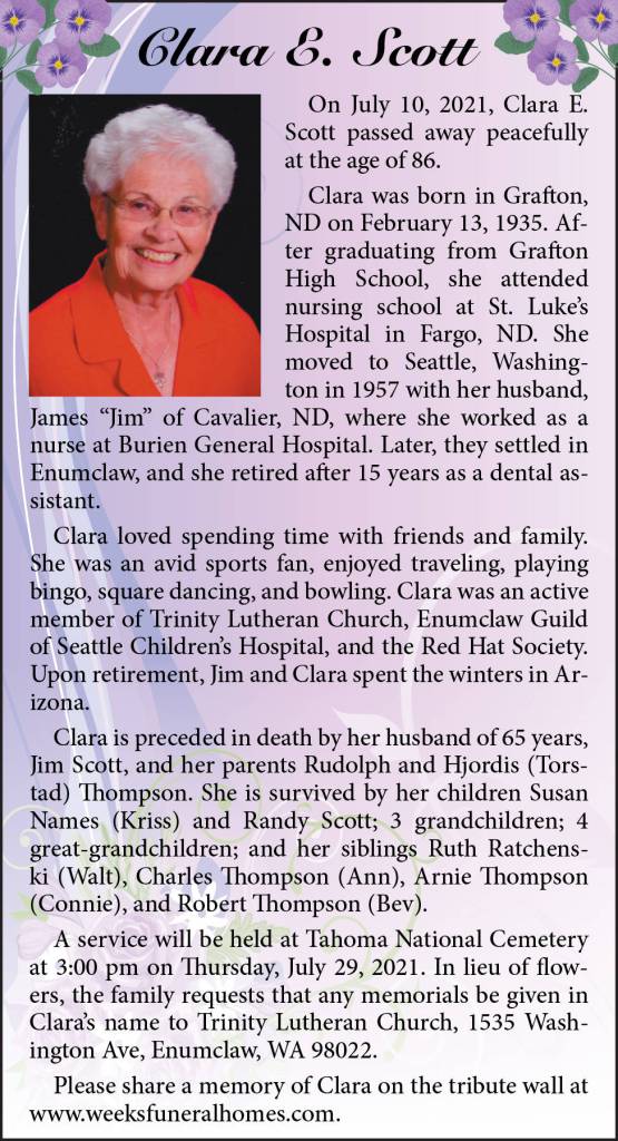 Clara E. Scott died July 10, 2021 at the age of 86.