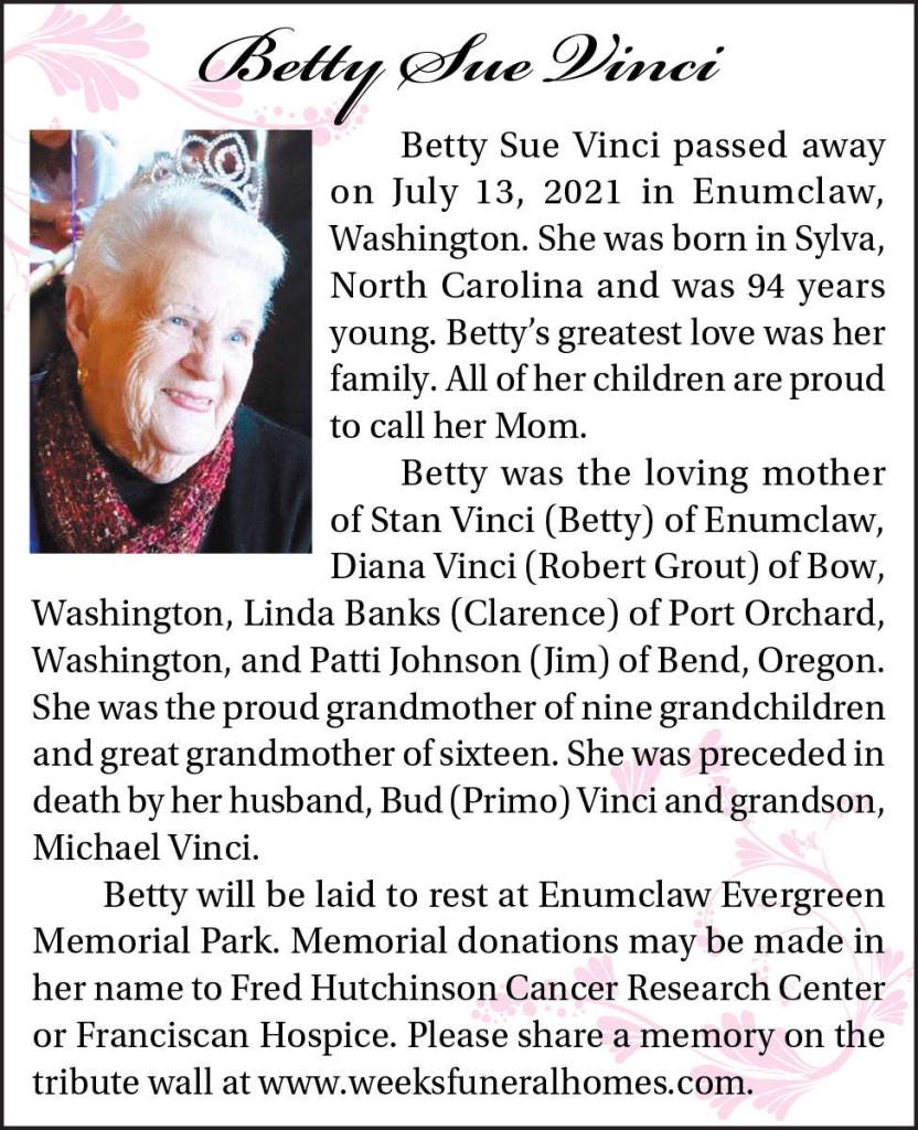 Betty Sue Vinci died July 13, 2021 at the age of 94.