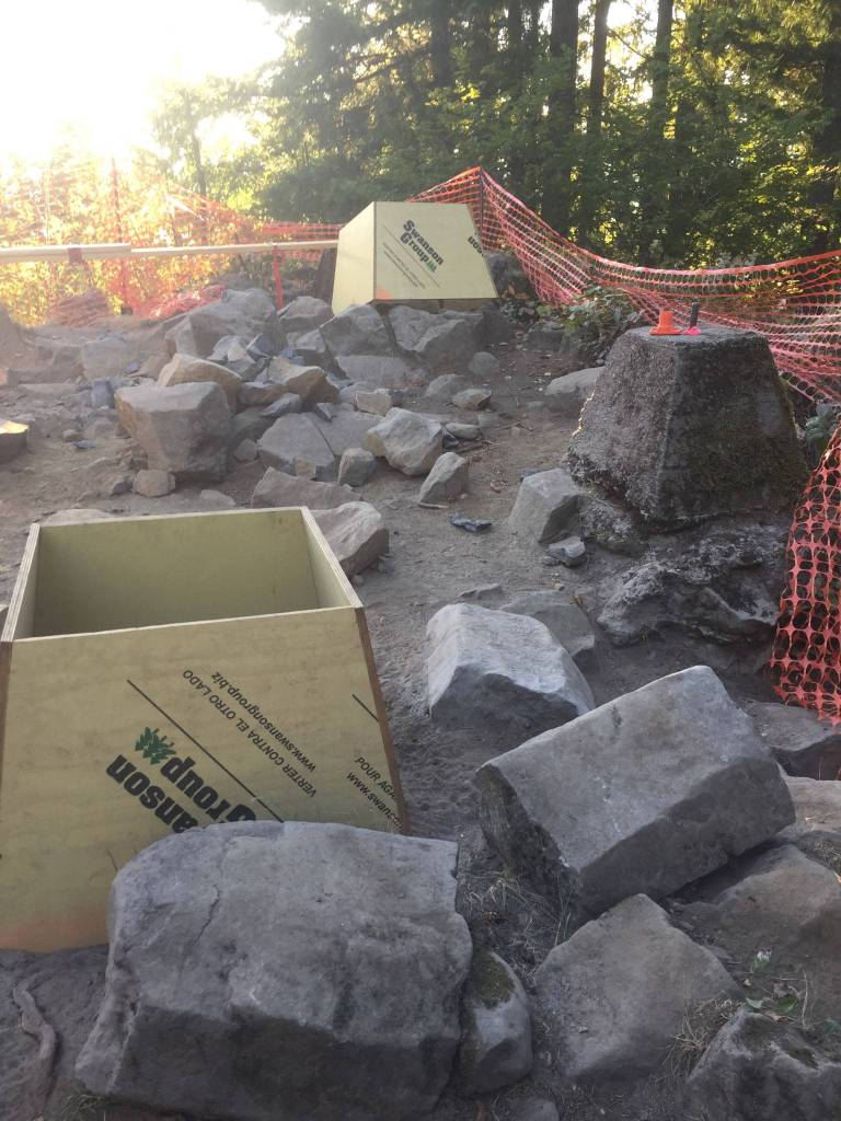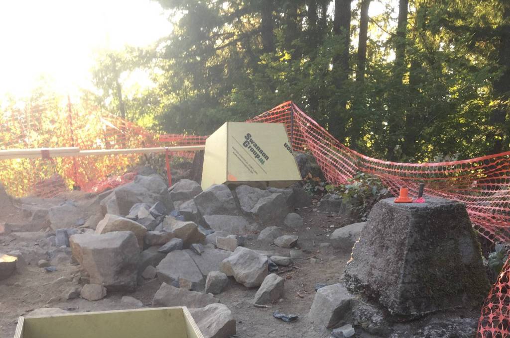 With necessary space created, workers went to the top and began the laborious process of drilling 16 holes into the columnar basalt formation. Those holes – drilled 6 feet deep with a diamond bit – will provide a stable base for the steel posts creating the tower.