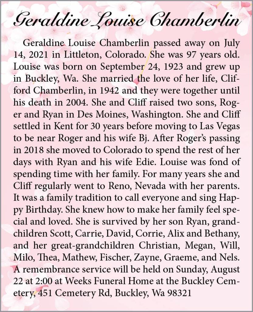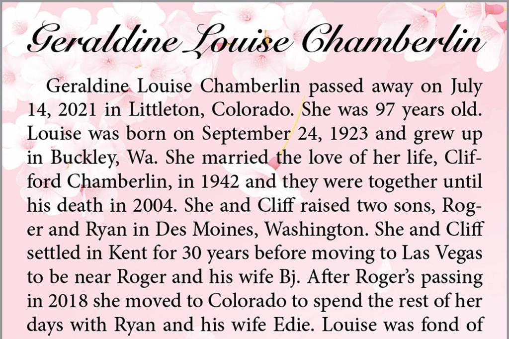 Geraldine Louise Chamberlin died July 14, 2021 at the age of 97.