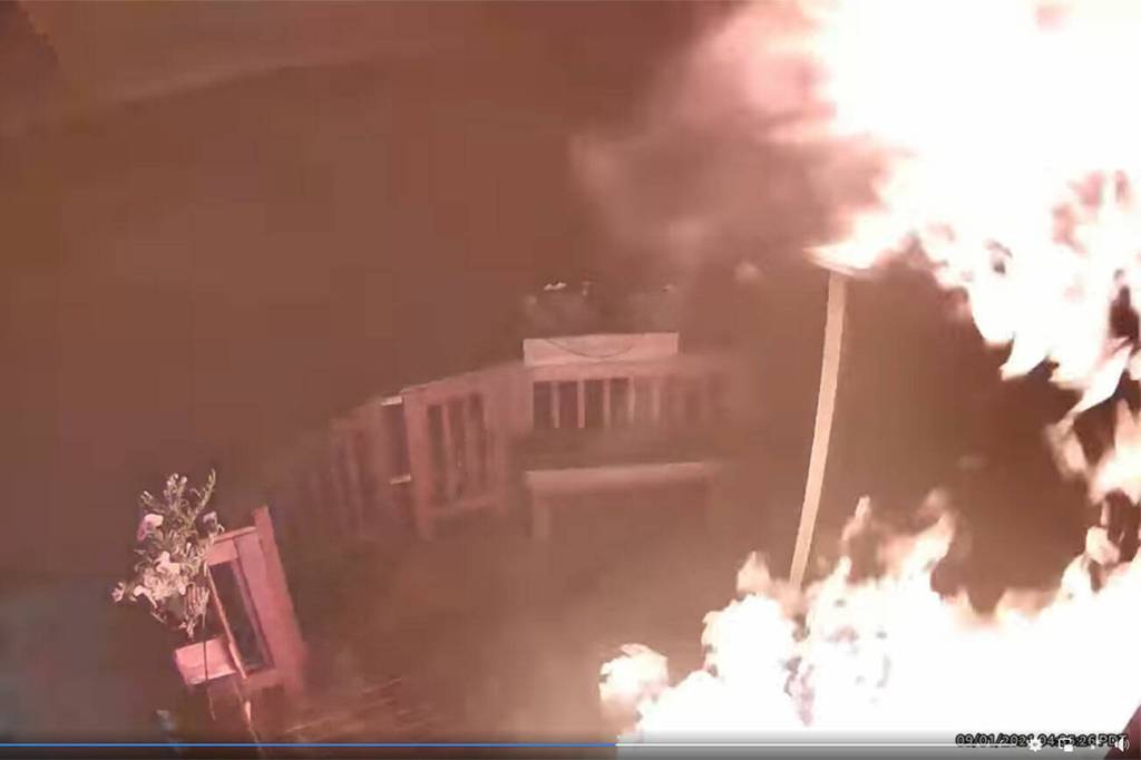 This image, taken from a video shared by the King County Sheriff’s Office, shows the conflagration started by an unknown person on the porch of an Enumclaw household. A link to the video is included in the article.