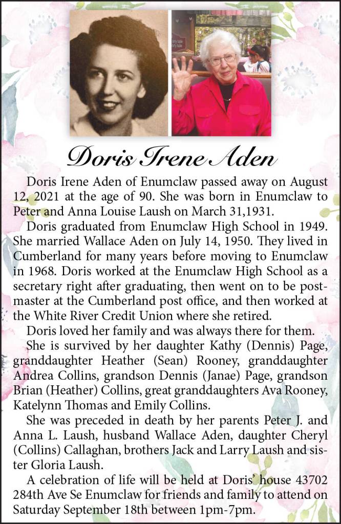 Doris Irene Aden died August 12, 2021 at the age of 90.