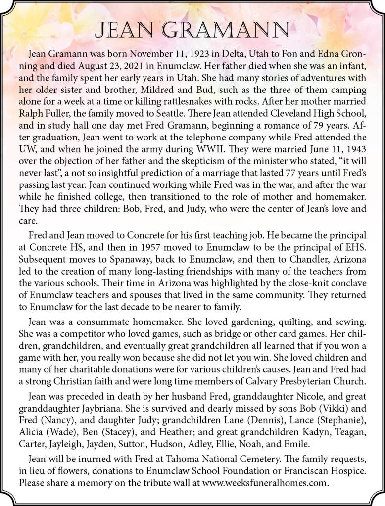Jean Gramann died August 23, 2021 at the age of 97.