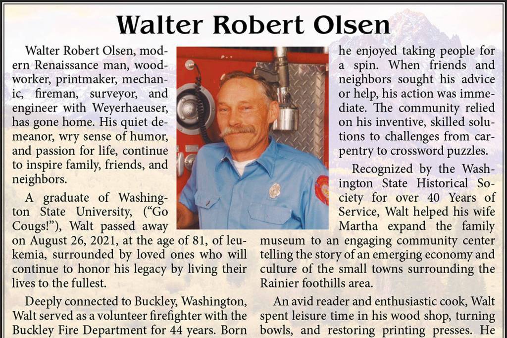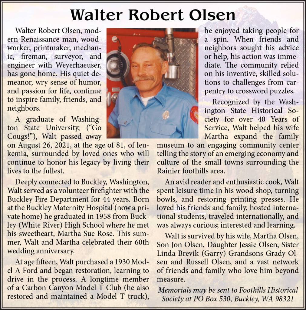Walter Robert Olsen died August 26, 2021 at the age of 81.