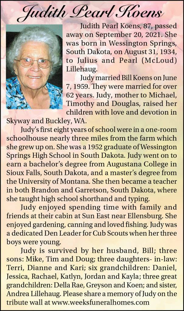 Judith Pearl Koens died Sept. 20, 2021 at the age of 87.