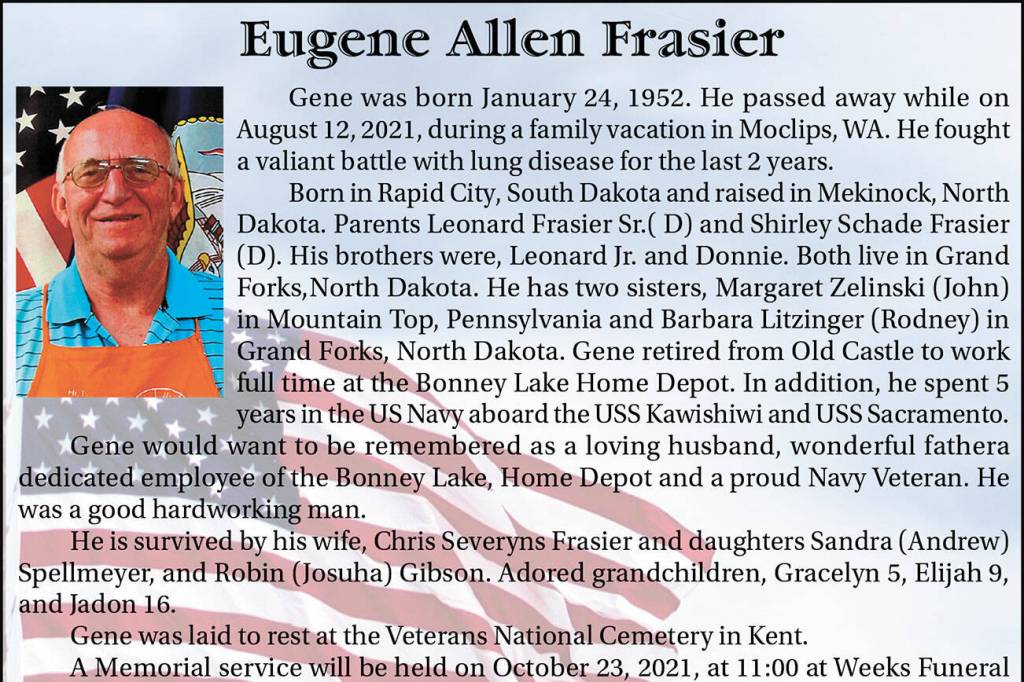 Eugene Allen Frasier died Aug. 12, 2021, at the age of 69.