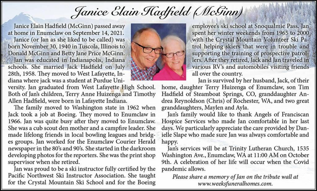 Janice Elain Hadfield (McGinn) died Sept. 14, 2021, at the age of 80.