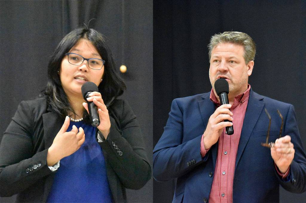 King County Council 9 candidates Kim-Khanh Van (left) and incumbent Reagan Dunn speak during the Courier-Herald’s candidate forum. Photo by Alex Bruell