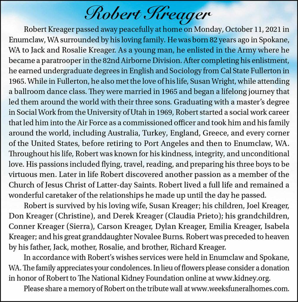 Robert Kreager died Oct. 11, 2021, at the age of 82.