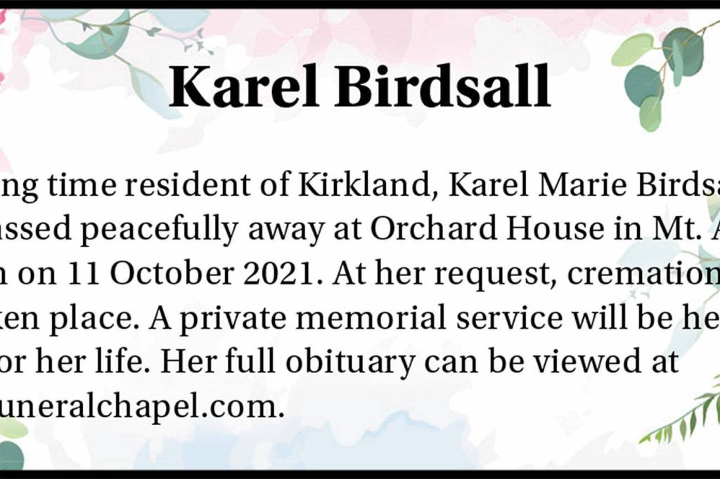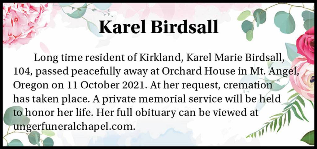 Karel Birdsall died on Oct, 11, 2021, at the age of 104.