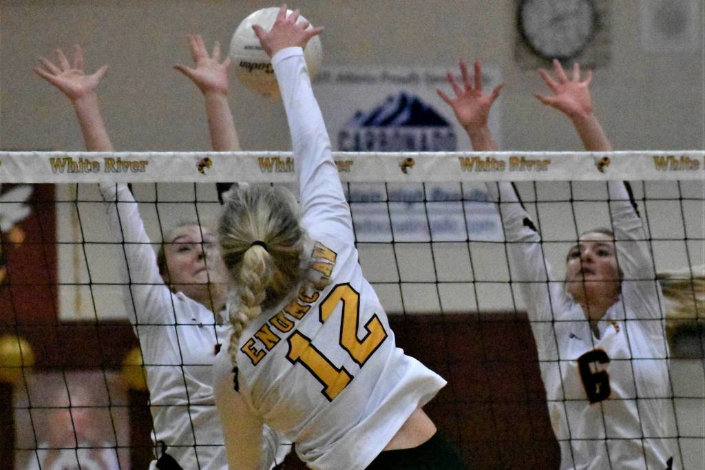 Enumclaw: Kira HaWaaboo 8 aces, 7 kills; Rosie Penke 9 kills; Macy Furtwangler 7 kills.