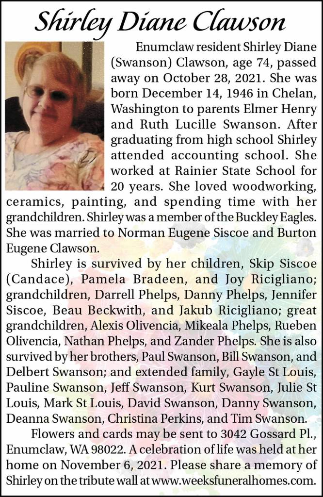 Shirley Diane Clawson died Oct. 28, 2021, at the age of 74.
