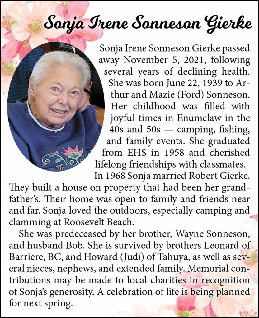 Sonja Irene Sonneson Gierke died Nov. 5, 2021, at the age of 82.