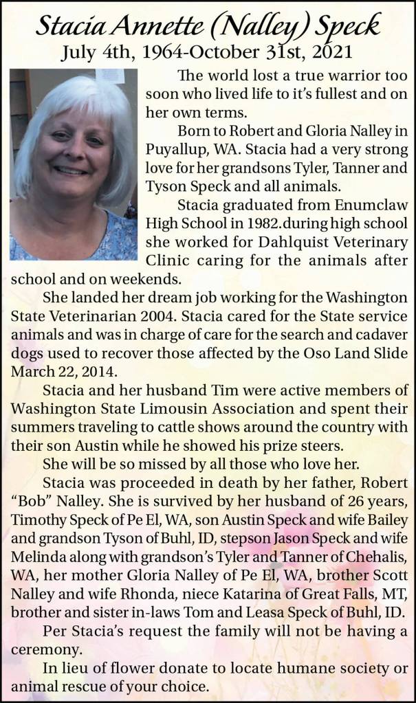 Stacia Annette (Nalley) Speck died Oct. 31, 2021, at the age of 57.