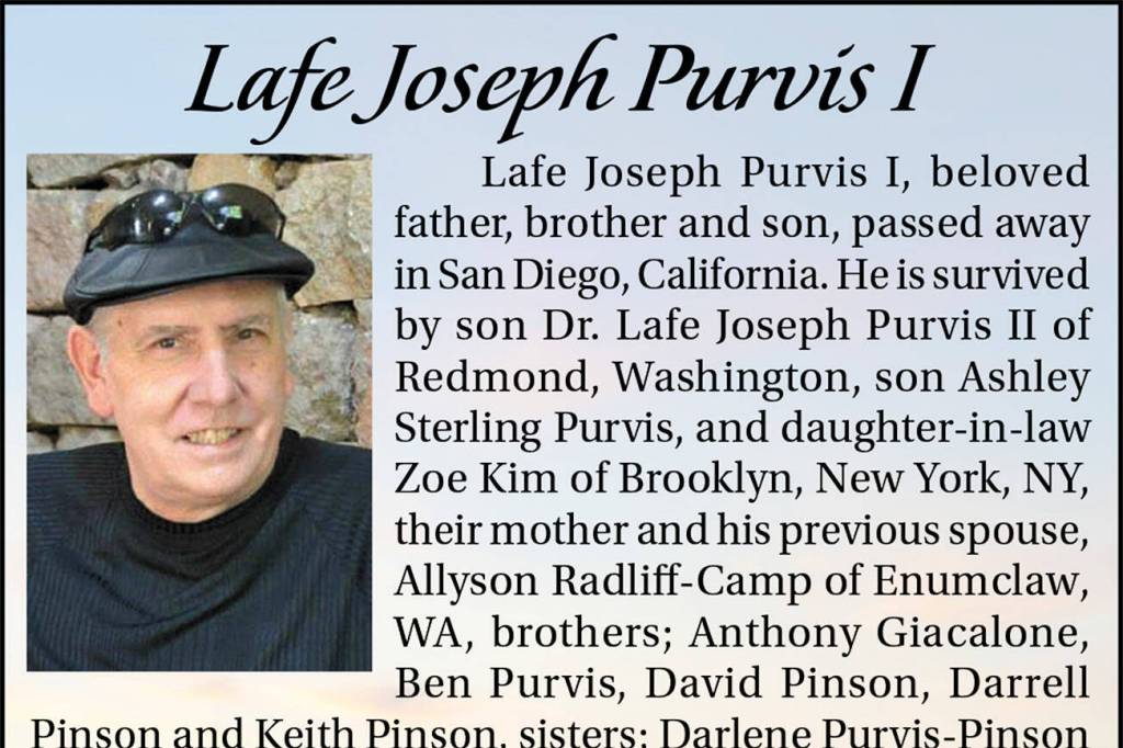 Lafe Joseph Purvis I died in San Diego, California.