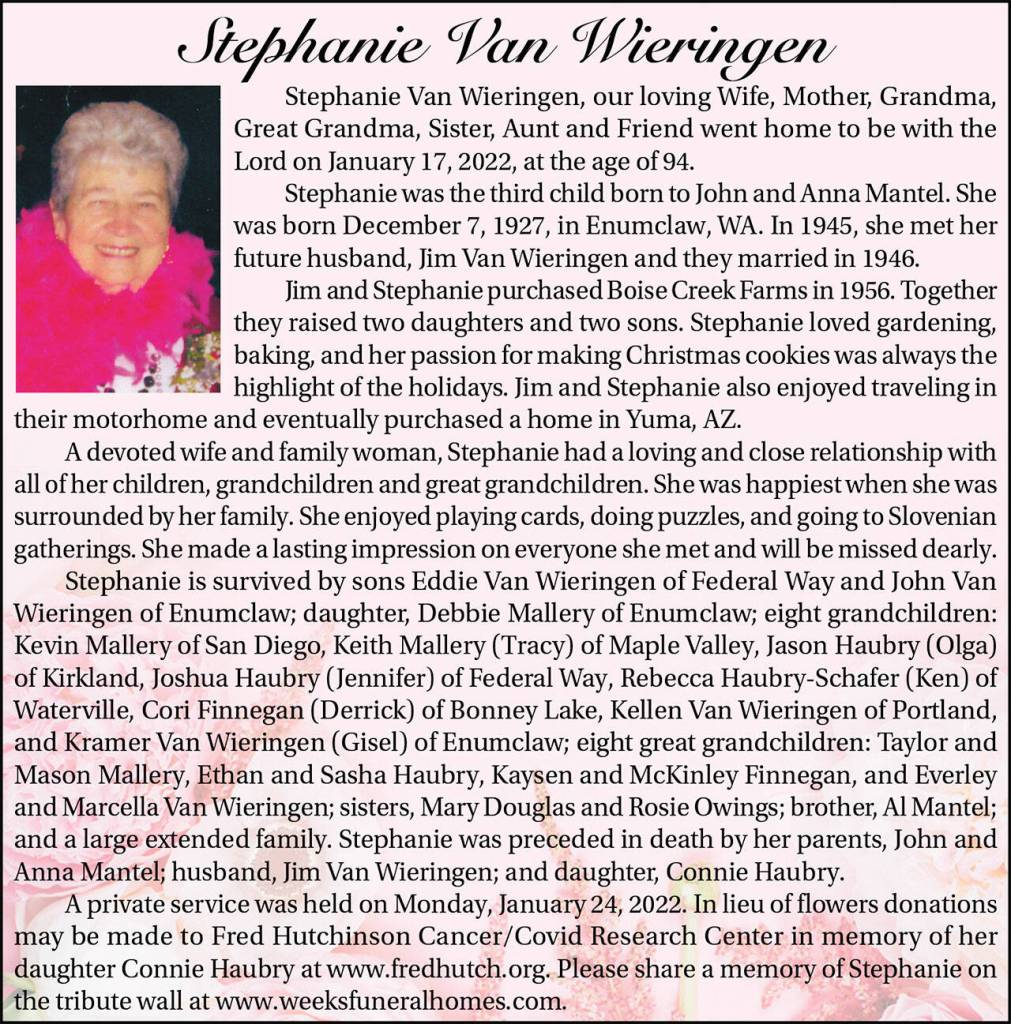Stephanie Van Wieringen died Jan. 17, 2022 at the age of 94.