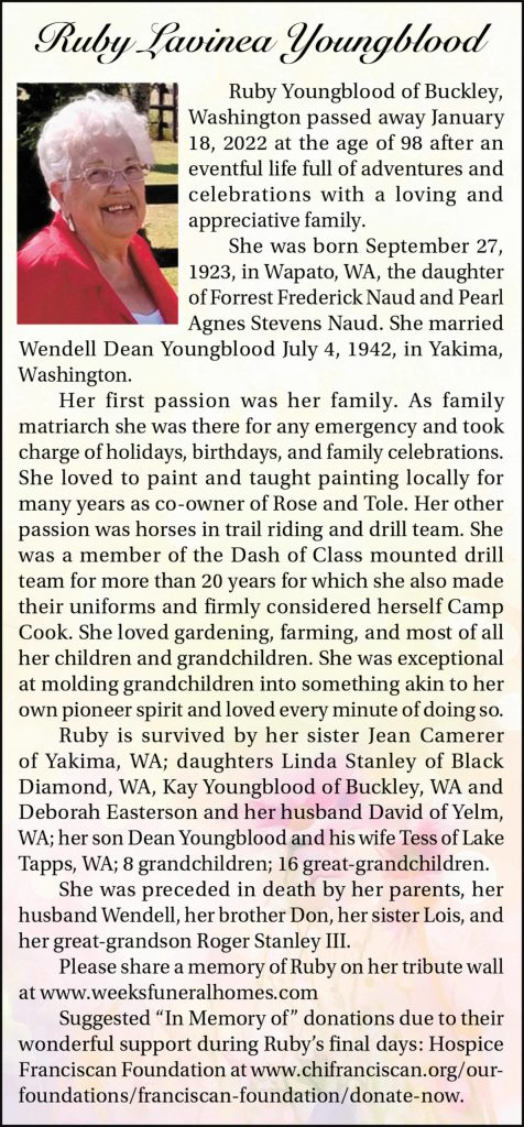 Ruby Lavinea Youngblood died Jan. 18, 2022, at the age of 98.