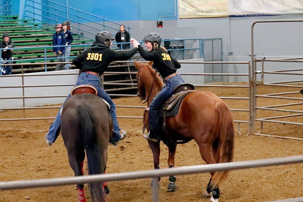 Seniors Kelsie Brock and Hailey Robinett, equestrian team captain, took first in the cow sorting (or ranch sorting) event, setting a new District 3 record of 54.9 seconds during the Feb. 10 to 13 meet at the Grace Harbor Fairgrounds in Elma. The previous record, set in 2019, was 55.8 seconds.