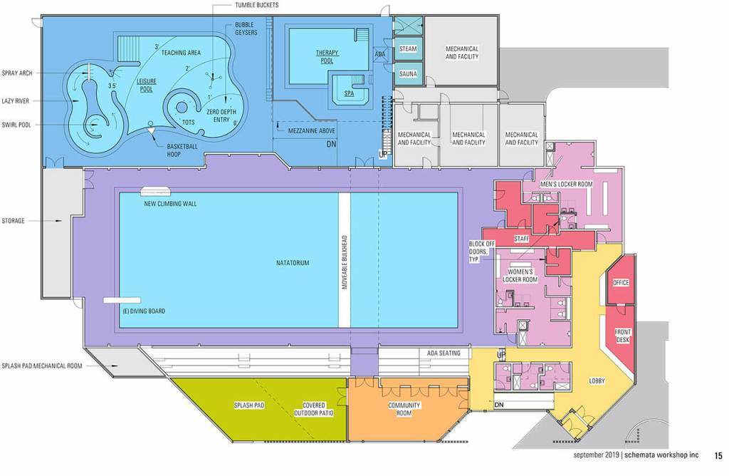 Assuming everything goes swimmingly, Phase 1 construction could begin in 2023, Larson said; planned improvements include revamping the entryway, build a new community/party room, transform the existing restroom and janitor area into two small family changing rooms and a non-gendered restroom, and various ADA upgrades to the parking lot, restrooms, locker rooms, and showers.