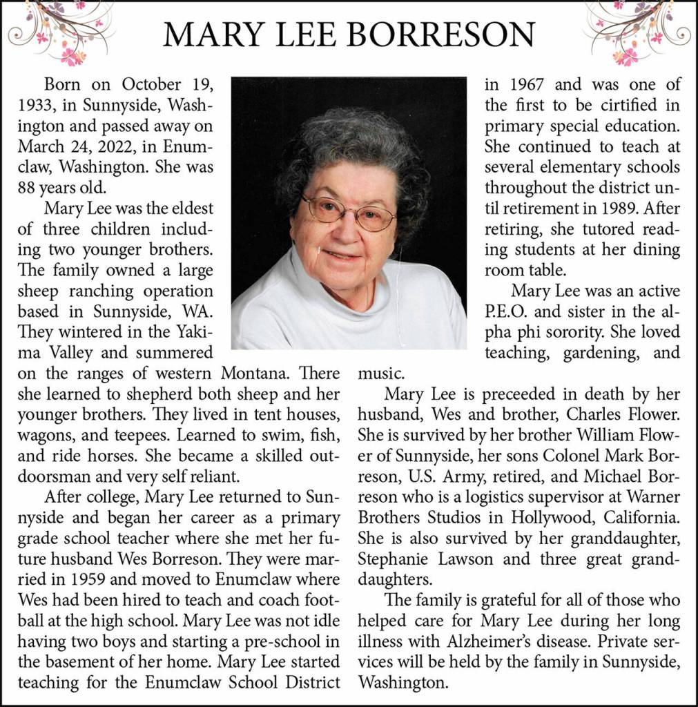 Mary Lee Borreson died March 24, 2022, at the age of 88.