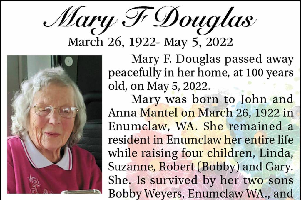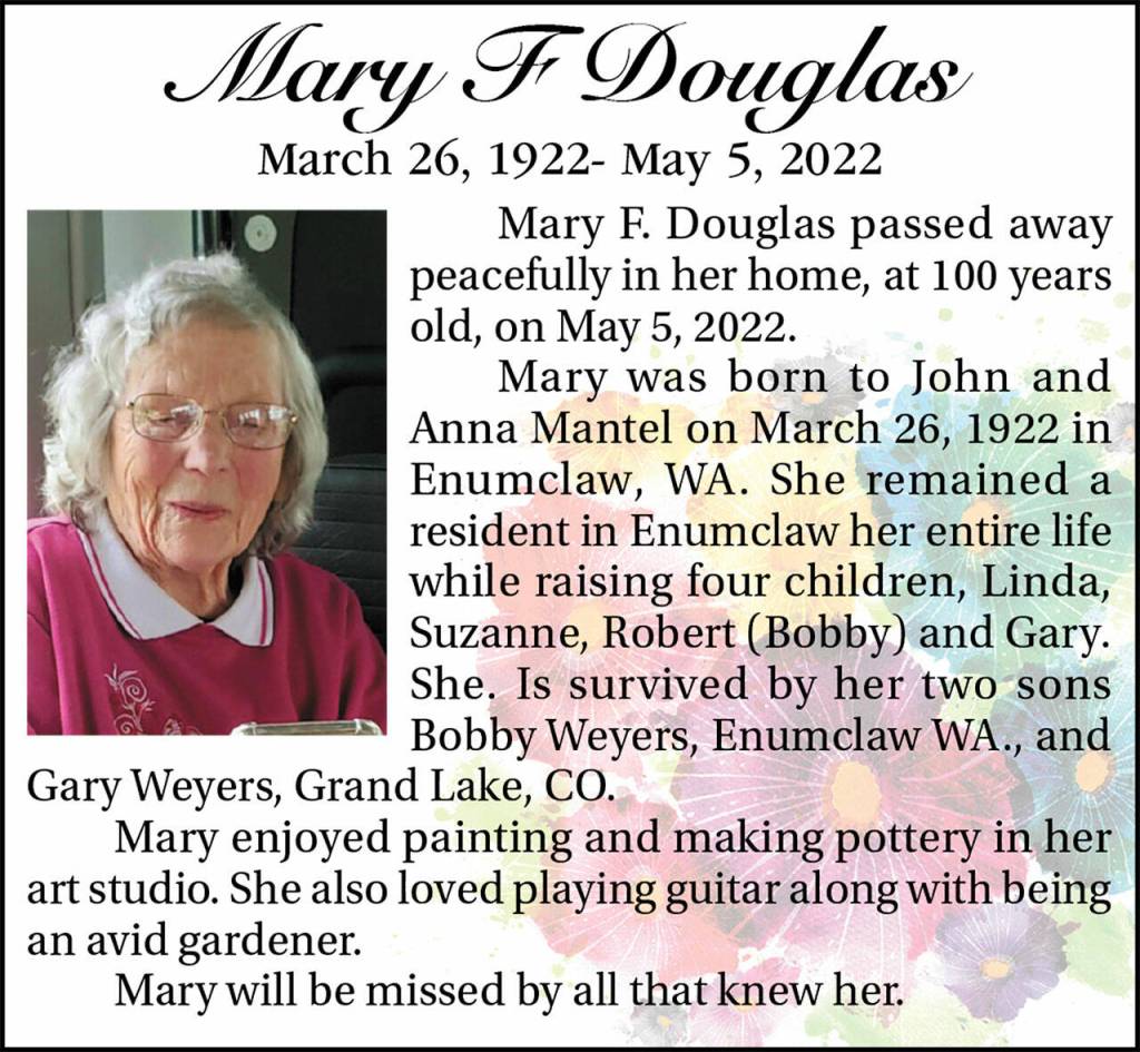 Mary F. Douglas died May 5, 2022, at the age of 100.