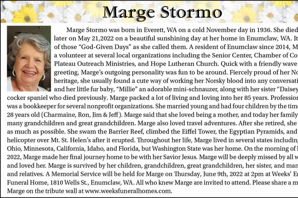 Marge Stormo died May 21, 2022 at the age of 85.