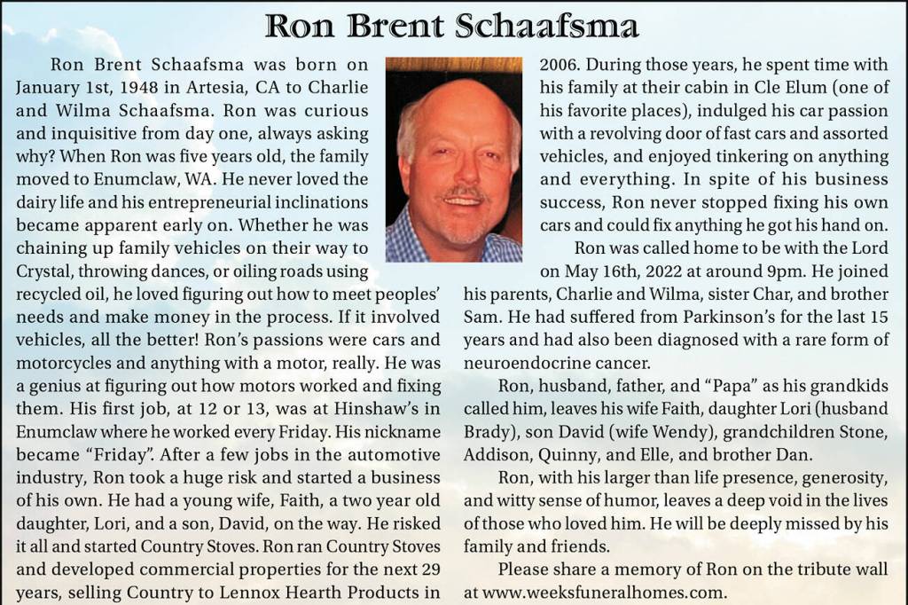 Ron Brent Schaafsma died May 16, 2022, at the age of 74.