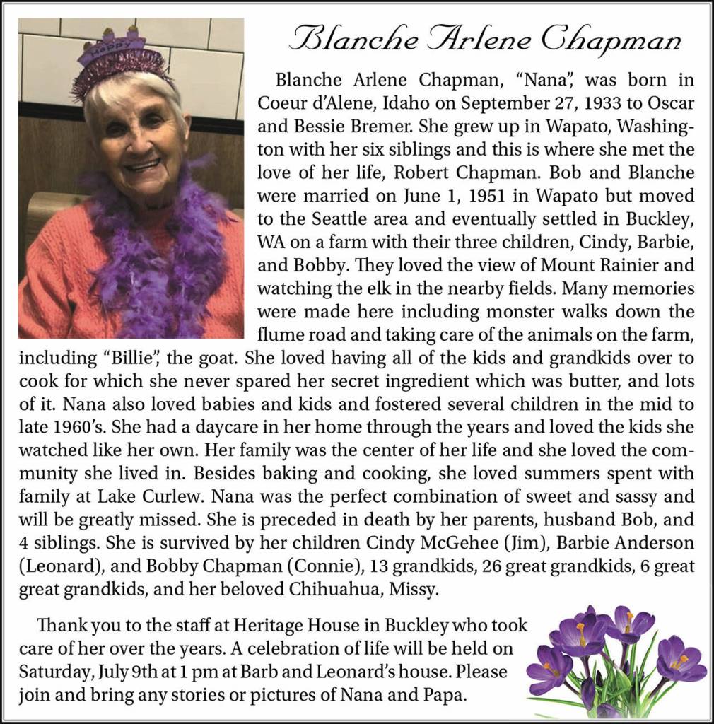 Blanche Arlene Chapman’s Celebration of Life is being held July 9.