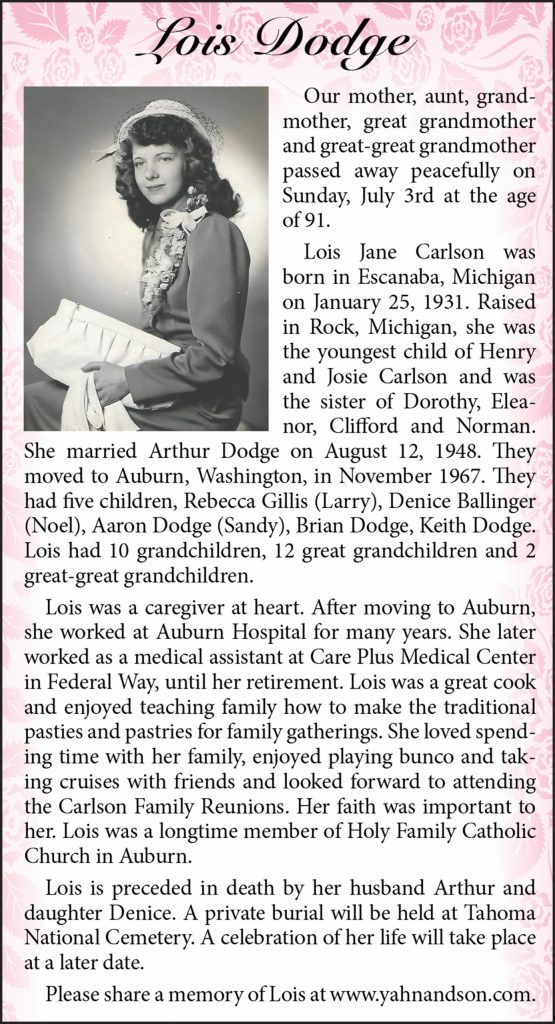 Lois Jane Carlson died July 3, 2022 at the age of 91.