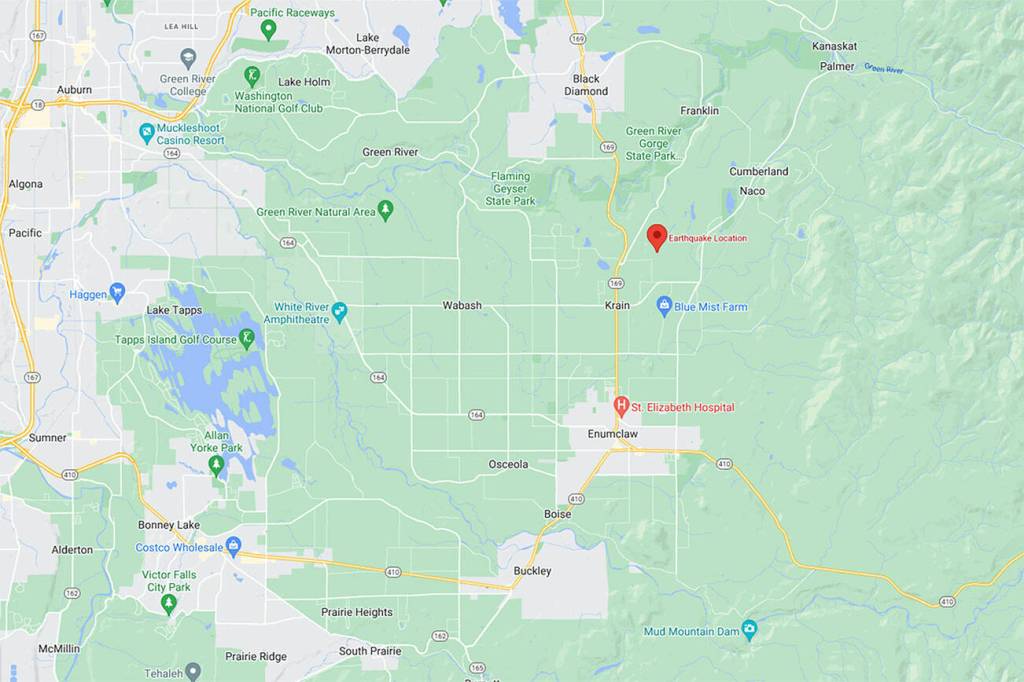 According to the United States Geographical Survey, the quake began at coordinates 47.259°N 121.972°W. For those who don’t want to pull out a maps app, that is roughly the intersection of 278th Ave. SE and SE 380th Pl. off Enumclaw-Franklin Road, around 4.6 miles from Enumclaw proper.