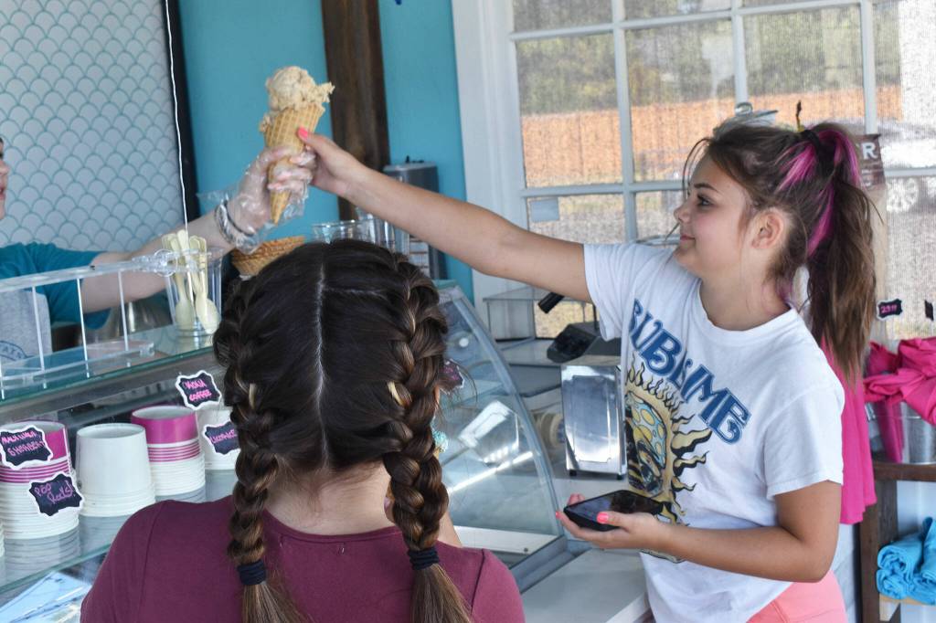 Melody Harris, 14, gets a cone of ice cream Friday afternoon at The Scoop.