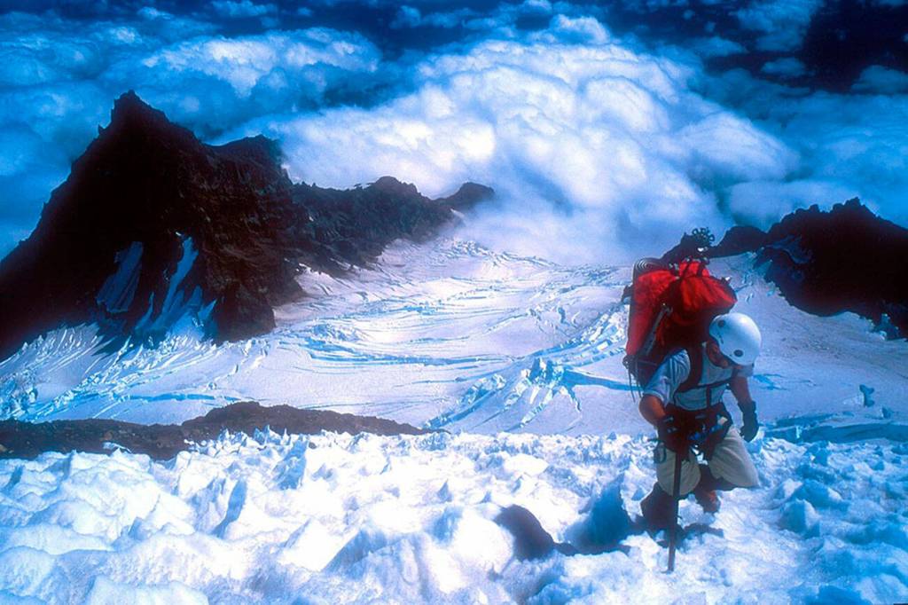 Disappointment Cleaver is the most popular summit route on Mr. Rainier; about 75 percent of all summit attempts take this path, and about 50 percent of those climbers succeed. Common hazards include icy slopes and crevasse falls.
